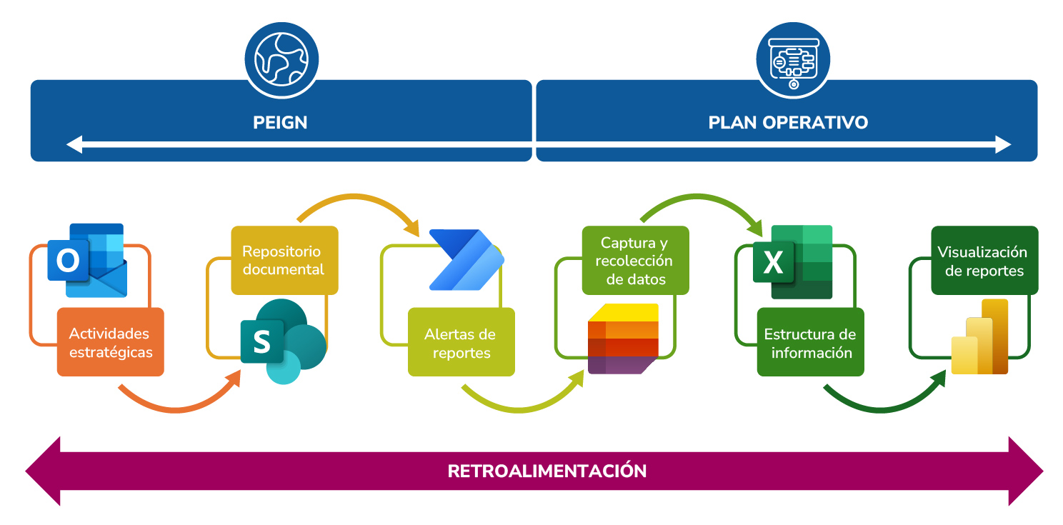 En ese sentido, este esquema actúa como un puente entre la planeación estratégica y la gestión diaria, permitiendo que las metas planteadas por la ICDE, por medio del PEIGN, no se queden en el papel, sino que se traduzcan en resultados concretos para el desarrollo del país en materia de datos geoespaciales.