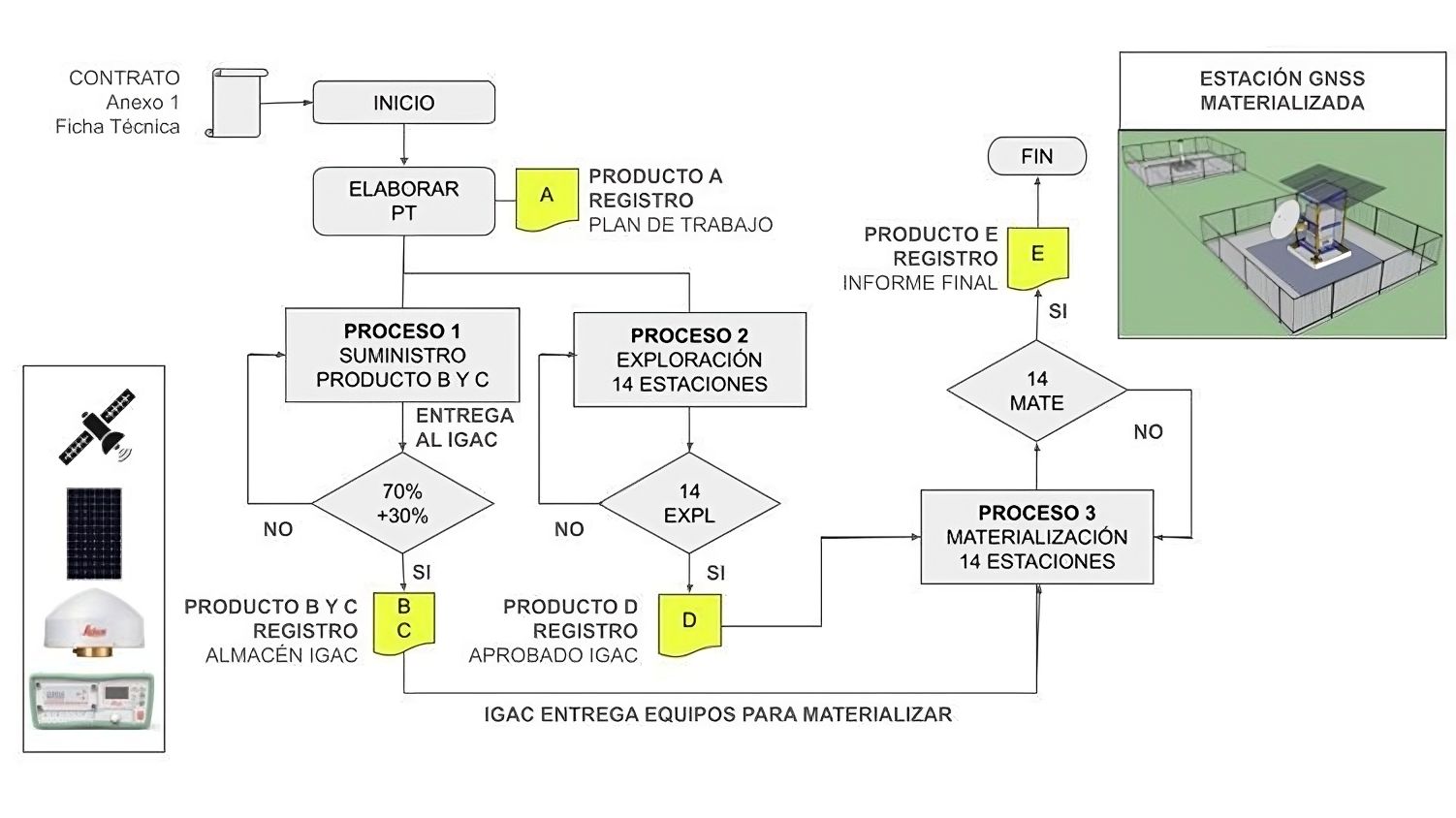 El proyecto se estructuró en varias fases: análisis normativo; adquisición de 45 nuevos equipos GNSS; exploración de nuevos sitios en municipios de sexta categoría; materialización de 26 nuevas estaciones; y su integración al Centro de Control Geodésico Nacional del IGAC.