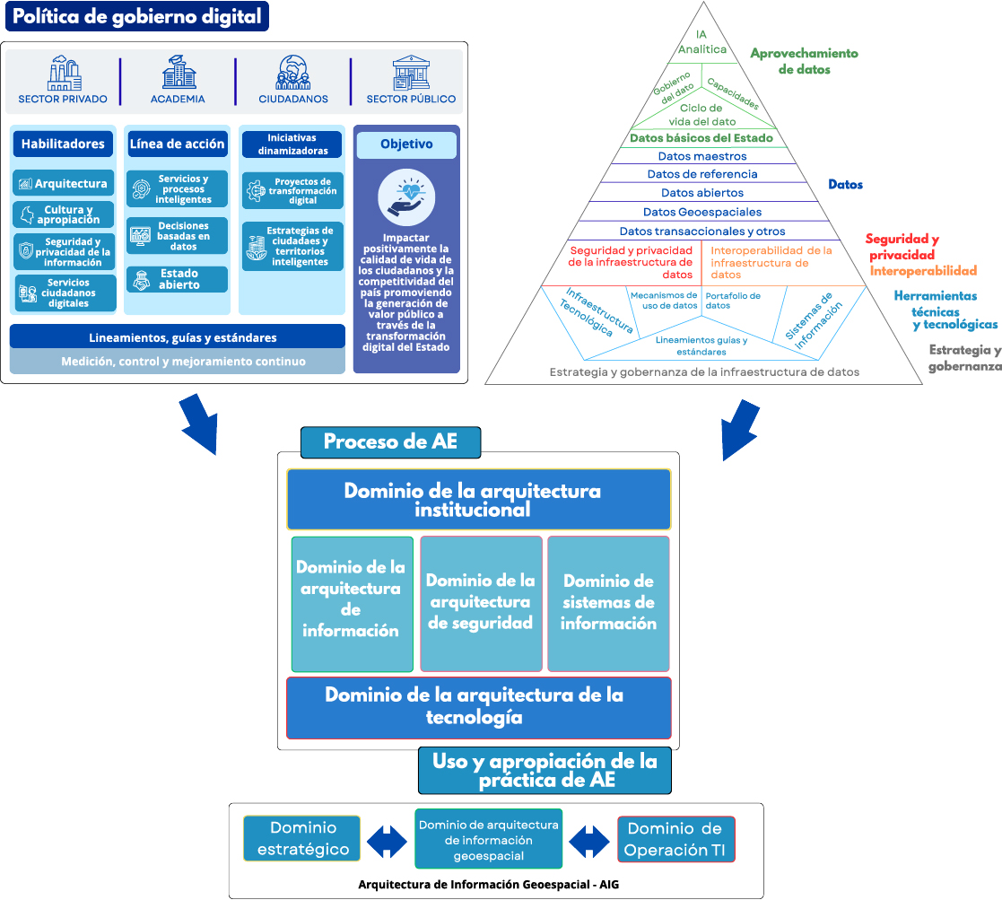 La AIG responde directamente al habilitador de Arquitectura y adopta otros como Cultura y Apropiación y Seguridad y Privacidad de la Información, aplicándolos al contexto de los datos geoespaciales. Esta definición conceptual permite que la AIG contribuya de manera directa a la implementación de las Líneas de Acción e Iniciativas Dinamizadoras, aportando al logro del objetivo superior de la PGD: “Impactar positivamente la calidad de vida de los ciudadanos y la competitividad del país, promoviendo la generación de valor público a través de la transformación digital del Estado”
