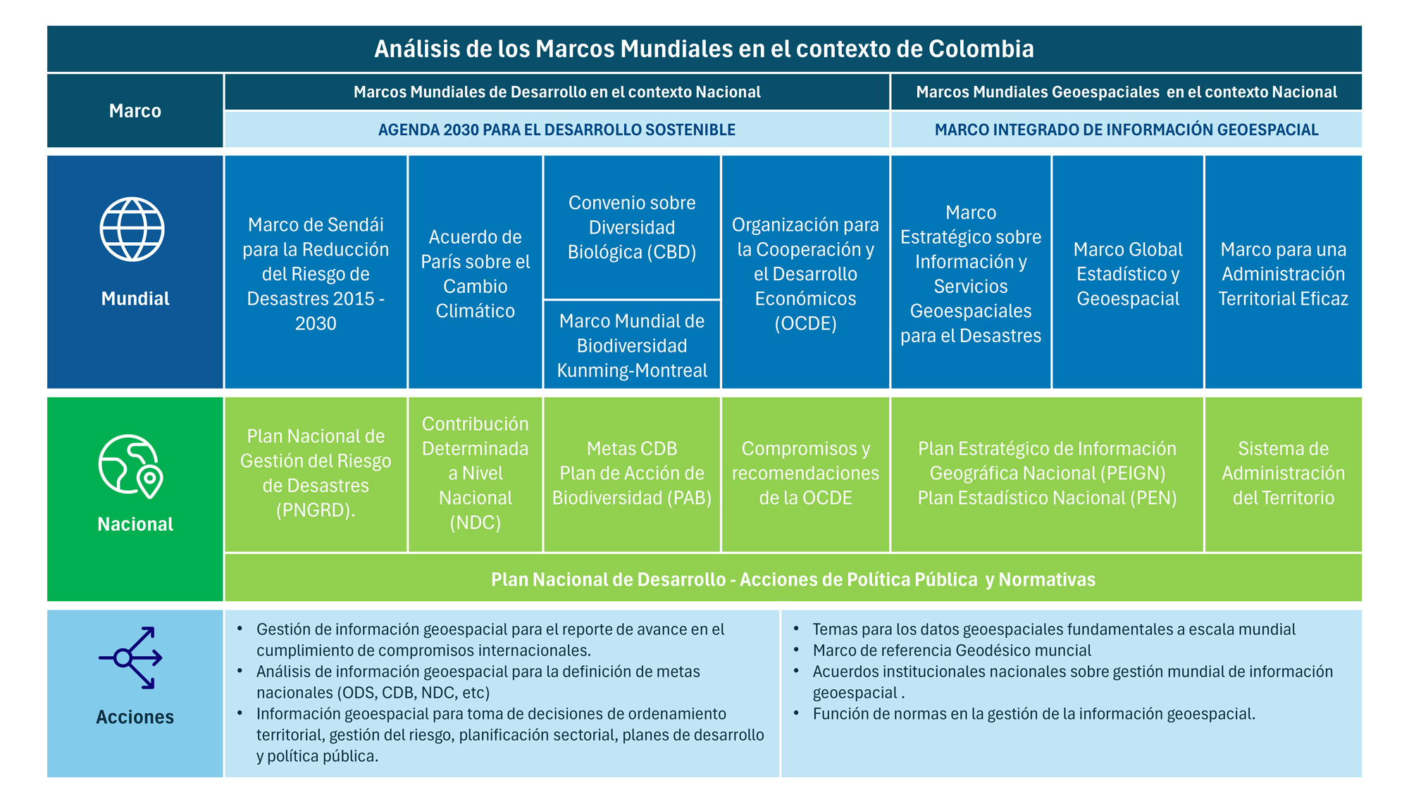 Colombia avanza significativamente en los instrumentos asociados a la gestión de información geoespacial, es así como se concibió el Plan Estratégico de Información Geográfica Nacional (PEIGN) el cual es un instrumento de planificación cuatrienal construido teniendo en cuenta los lineamientos del Marco Integrado de Información Geoespacial de las Naciones Unidas, el UN-IGIF se basa en nueve (9) vías estratégicas y en tres (3) áreas principales de influencia: gobernanza, tecnología y personas. El objetivo de las vías estratégicas es guiar a los gobiernos hacia la implementación de sistemas integrados de información geoespacial que permitan alcanzar una visión de desarrollo social, económico y medioambiental sostenible. (ICDE, 2024)