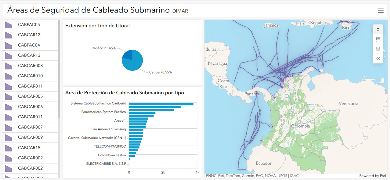 - Áreas de Seguridad de Cableado Submarino: DIMAR publicó el servicio interoperable del Objeto Territorial Legal de Áreas de Seguridad de Cableado Submarino, este tablero de control permite analizar Las áreas de seguridad de los cables submarinos de fibra óptica en los espacios marítimos jurisdiccionales de Colombia son zonas especialmente delimitadas para proteger esta infraestructura contra posibles daños. Estas áreas se trazan a lo largo del recorrido de los cables con el fin de prevenir afectaciones derivadas de actividades como la navegación, la pesca o el fondeo de embarcaciones. Su propósito principal es garantizar la operación continua y segura de esta infraestructura crítica para las comunicaciones del país.