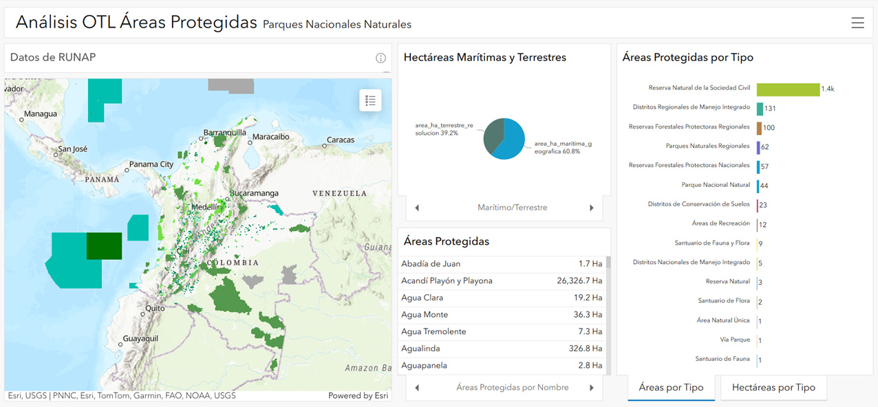 - Áreas Protegidas RUNAP: Parques Nacionales Naturales de Colombia, a través del Registro Único Nacional de Áreas Protegidas (RUNAP), publicó el objeto territorial legal (OTL) de las áreas protegidas del país. Este tablero de control le permitirá consultar de manera dinámica las categorías de manejo reconocidas oficialmente, identificar las áreas protegidas administradas por cada autoridad ambiental y analizar la superficie cubierta, tanto terrestre como marina, de estas áreas.