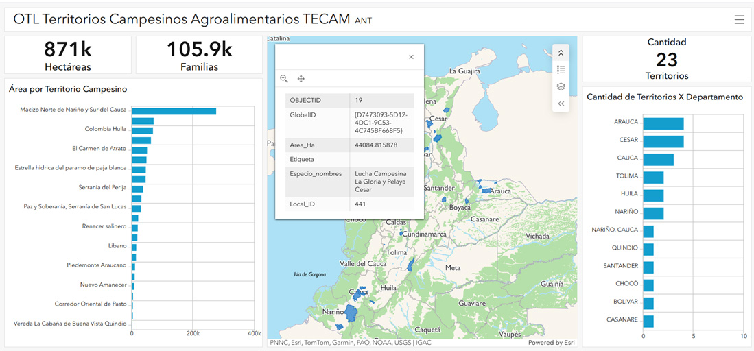 - OTL TECAM: La Agencia Nacional de Tierras publicó los datos del OTL de Territorios Campesinos Agroalimentarios - TECAM, una forma de organización campesina que garantiza la soberanía alimentaria, la permanencia en el territorio y el reconocimiento del campesinado, el tablero de control muestra estadísticas de los territorios campesinos agroalimentarios.