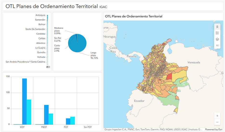 - OTL POT: El IGAC ha publicado los servicios de Zonificación, Clasificación del suelo y vigencia según los Planes de Ordenamiento Territorial a través de Colombia OT. Este tablero de control permite analizar esta información a través de cifras que brindan un estado general de los POT.