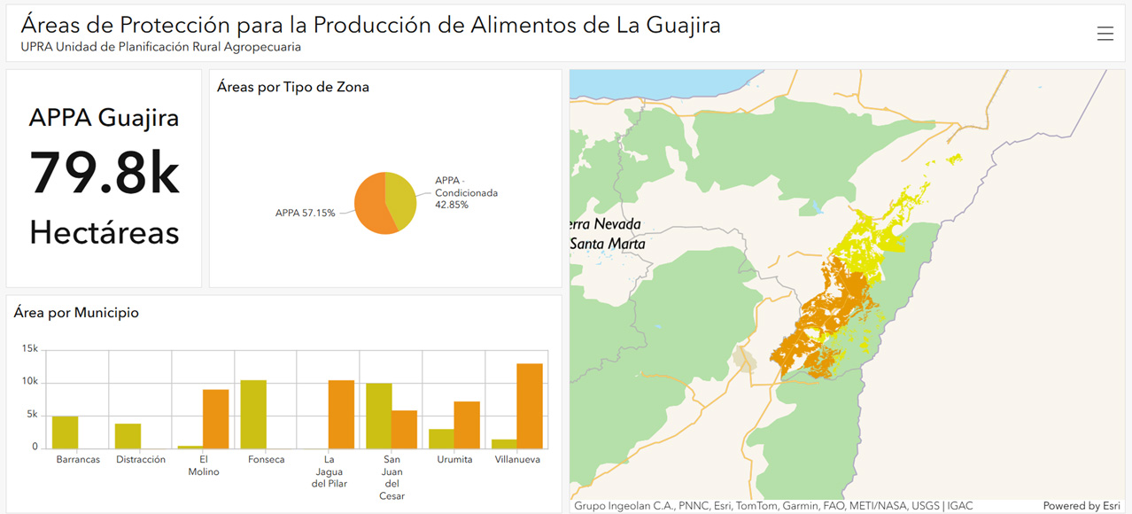 - APPA – Áreas de Protección para la Producción de Alimentos: Las Áreas de Protección para la Producción de Alimentos - APPA: son aquellas áreas destinadas a la producción de alimentos que se constituyen en determinantes de ordenamiento territorial y norma de superior jerarquía, de acuerdo con el artículo 32 de la Ley 2294 de 2023, que hacen parte de las áreas de especial interés para proteger el derecho humano a la alimentación y gozan de especial protección del Estado, ubicadas dentro de la frontera agrícola nacional y que deben mantenerse en el tiempo, el tablero presenta estadísticas de las APPA publicadas por la Unidad de Planificación Rural Agropecuaria UPRA.